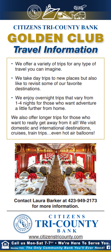 Citizens Tri-County Bank Golden Club Some of these dates are subject to change Please contact Laura for more info 423-949-2173